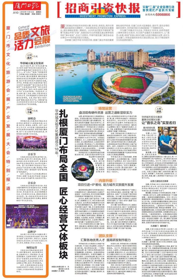 厦门日报特别报道|深度解读华侨城天视文化集团的运营之道 业界动态, 公司新闻, 新闻中心, 集团新闻天视文化集团2019年11月14日 今日,厦门日报推出“厦门市文化旅游会展产业发展大会”特别报道,整版篇幅深度解读华侨城天视文化集团,讲述集团文体运营的匠心情怀。 本文刊登于 2019年11月14日《厦门日报》第A10版 记者:刘筠 以下是厦门日报11月14日第A10版的报道内容 核心提示:如果说中国经济有上下半场之分,上半场是资本投资搭建骨架,下半场则是精细化运营填充内容。下半场时代,缺的不是产品与资详情